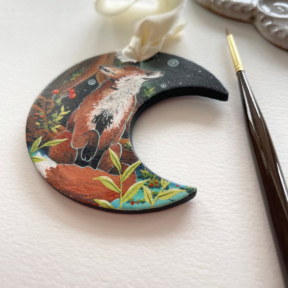 Hand-painted with gouache, this one-of-a-kind enchanted forest ornament will add a little whimsy to your Christmas tree (or wherever you choose to hang it!).