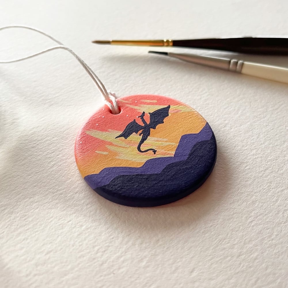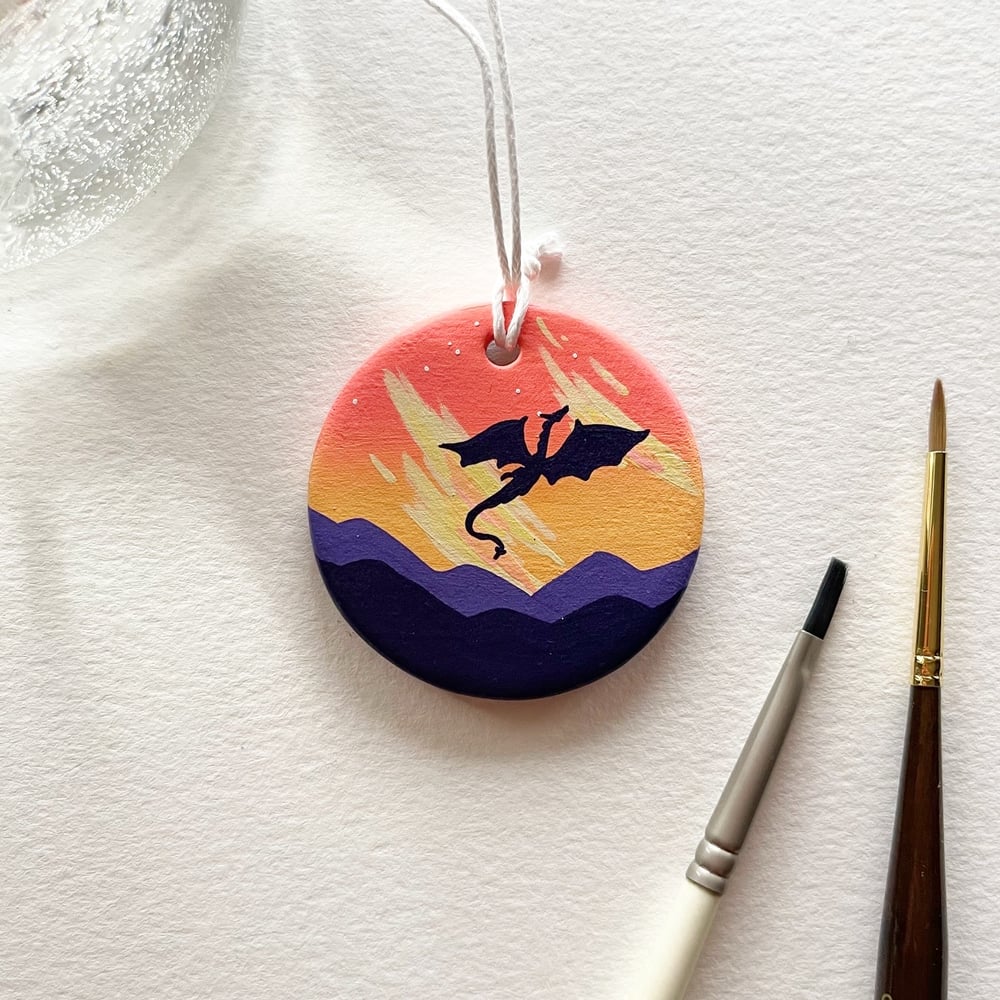 Hand-painted with gouache (and a touch of magic!), this one-of-a-kind dragon in flight ornament will add a little whimsy to your Christmas tree (or wherever you choose to hang it!).